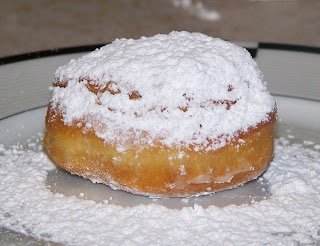 When you take them out of the oil, drain them, let them cool just a second, then generously cover them in powdered sugar. I use a sifter.