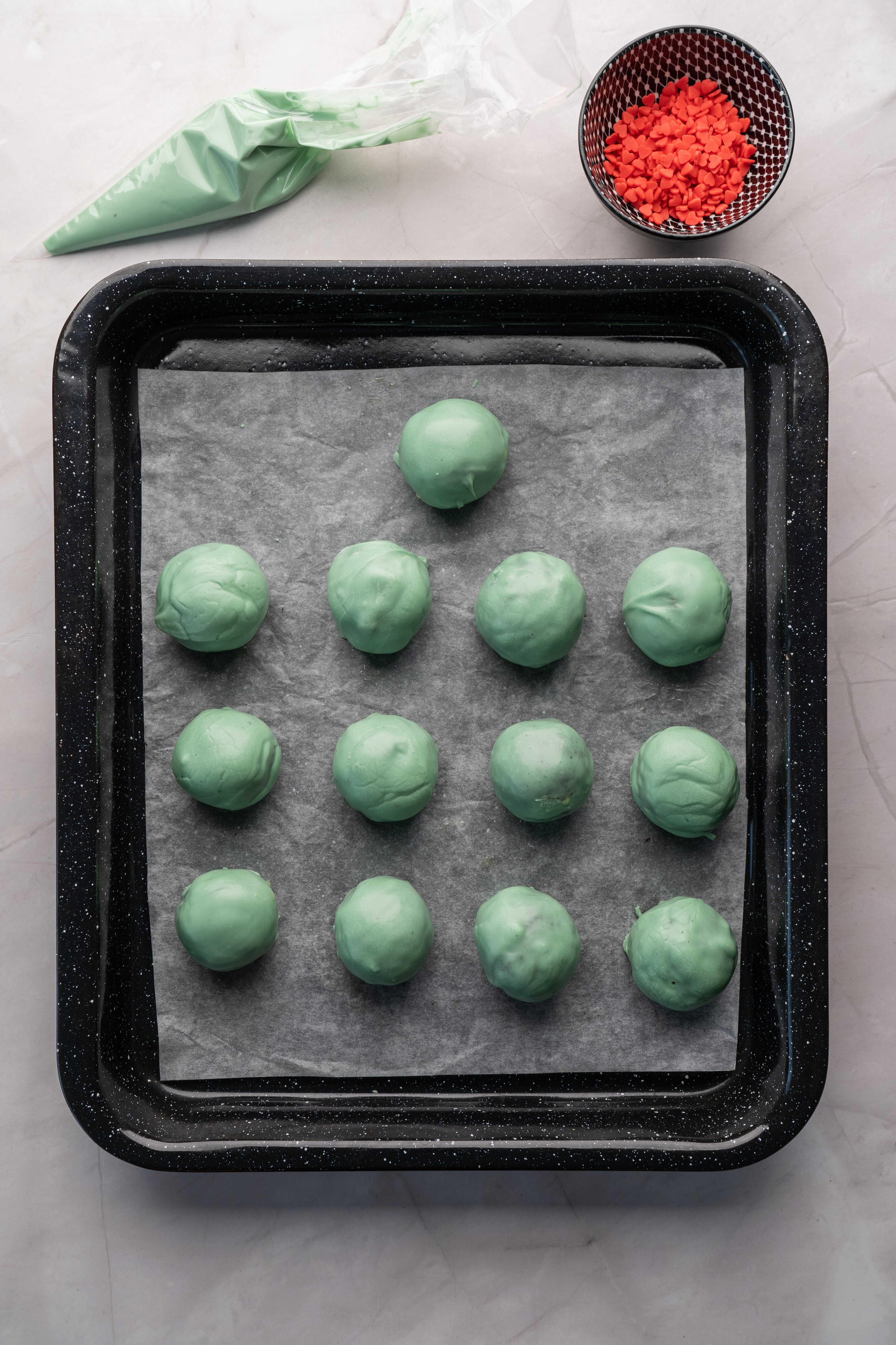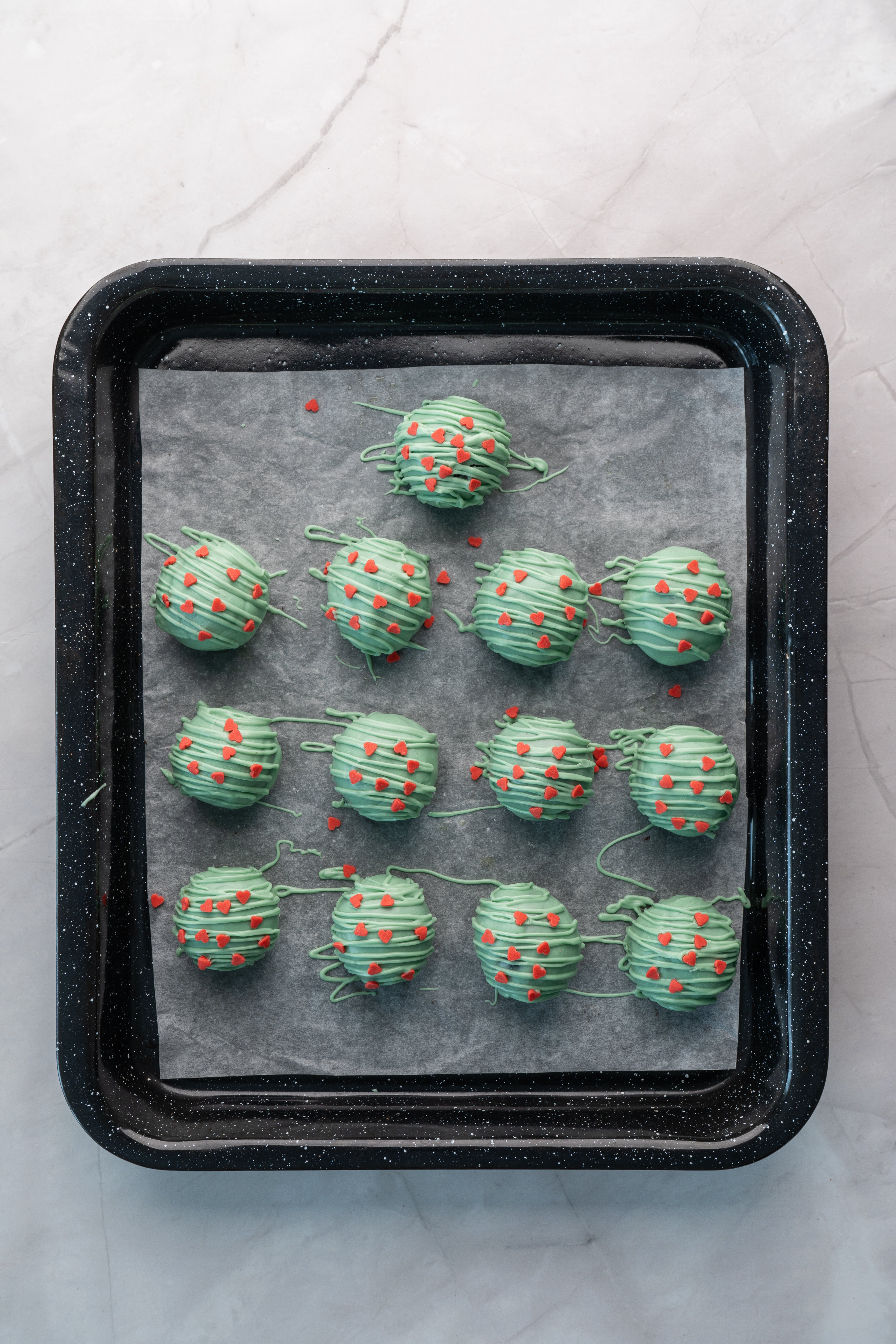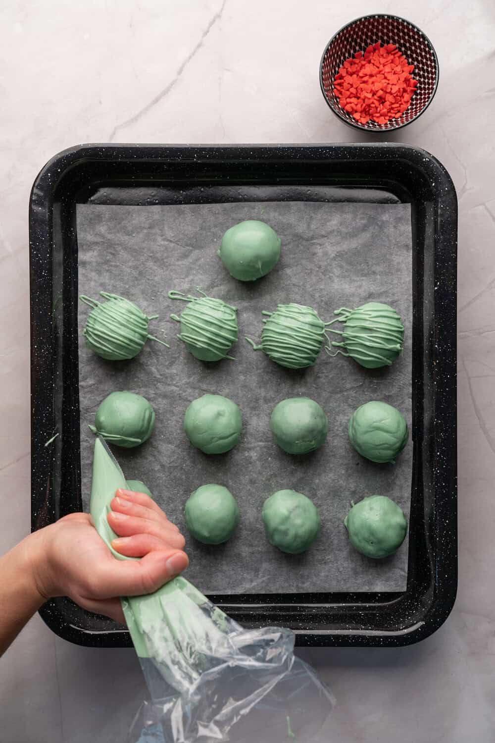 - Remove the chilled balls from the fridge. Dip each one into the melted green chocolate using a fork or toothpick. Be sure to cover the entire ball, then gently tap to remove excess chocolate.