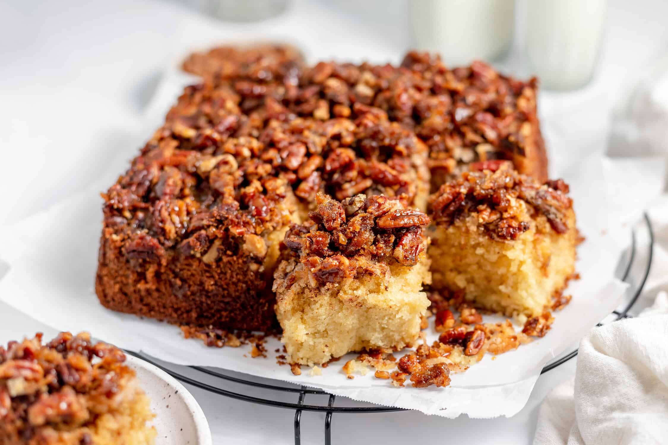 Baked in a simple 8×8-inch pan, it’s an easy, old-fashioned single layer cake that looks delicious when flipped out and has the flavors of a classic pecan pie. Everyone is going to love this simple, tender cake with the crunchy pieces of pecans on top!