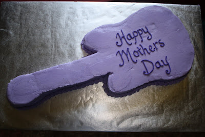 On Thursday, first I baked a Caramel Cake and a few Dark Chocolate Cupcakes with Caramel Buttercream and Mini Chocolate Chips (above). Then I baked a huge chocolate sheet cake… and a smaller chocolate sheet cake, and I put them together and carved them into an electric guitar shaped cake.