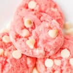 These Strawberry Cake Mix Cookies are soft, moist, and full of bold strawberry flavor, with white chocolate chips in every bite. Made with just a handful of ingredients and no chilling required, they’re an easy, fuss-free cookie. They’re perfect for Valentine’s Day, spring parties, or anytime you’re craving a quick strawberry dessert.