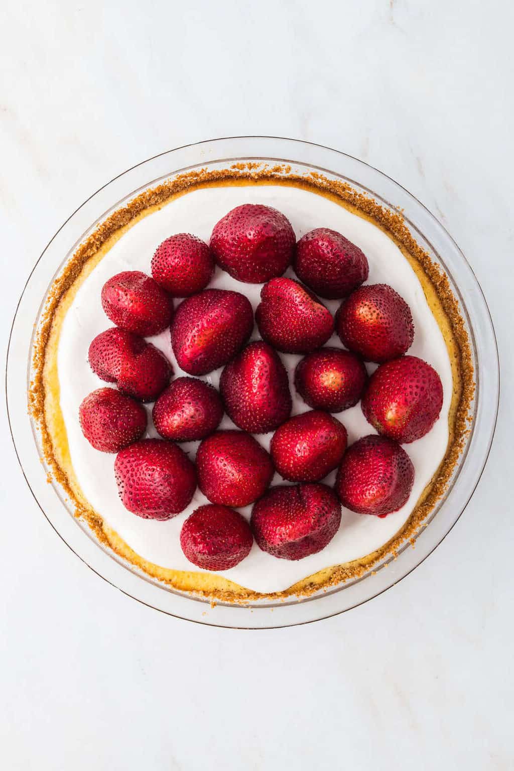 - For the strawberry layer, remove the tops from the strawberries and place them upside down on the pie.