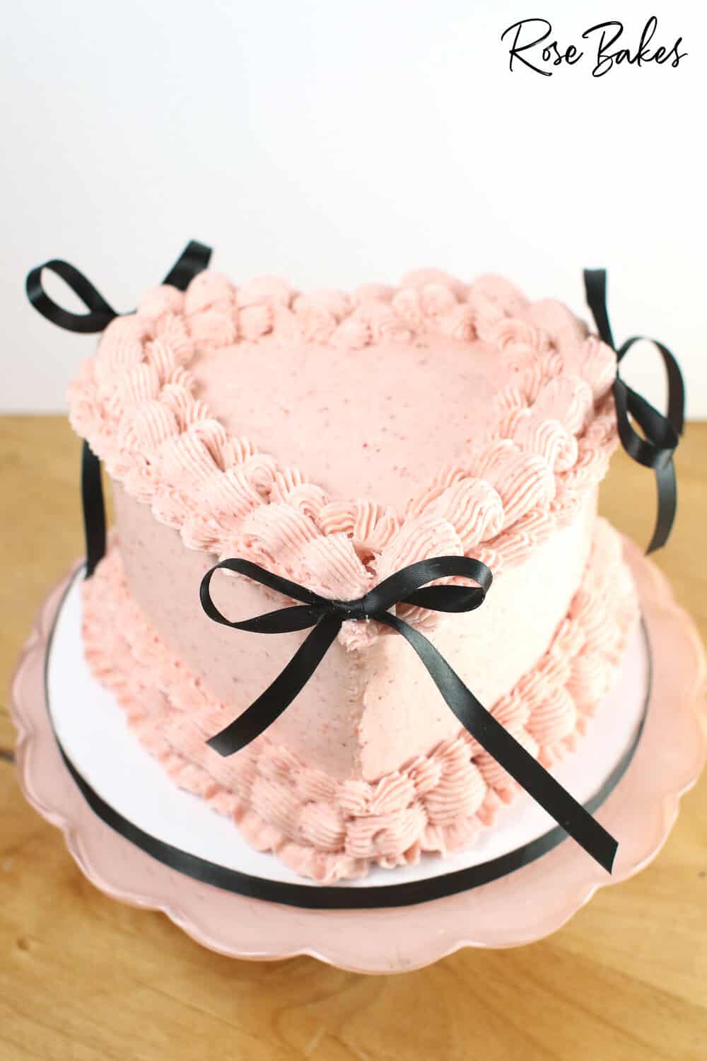 This sweet heart cake was for a birthday but also would be perfect for Valentine’s Day. Strawberry Cake with Strawberry Buttercream and tiny black ribbons for accents. The vintage piping is so popular right now and I love it!